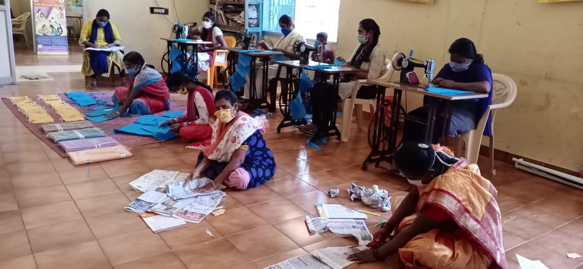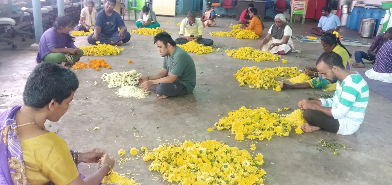 (SDGs 1,5,8) Our work on livelihoods focuses on women and PWDs to empower them. Our Skill training program for women encompasses multiple local trade skills that lead to a sustainable income. To enable this further, we have created SHGs facilitate the availability of capital. Through the Manasadhara centre we have ensured safe and sustainable livelihoods for PWDs and women through colour-making and leaf plate-making initiatives.